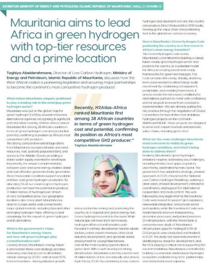 وأشارت منت عبيد الرحمن إلى أن تخصيص 5 بالمائة من السواحل يمكن أن يتيح إنتاج نحو 12 مليون طن من الهيدروجين سنويًا بأسعار تنافسية.