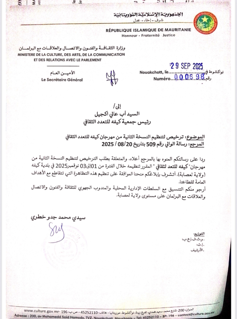 رخصت وزارة الثقافة لجمعية كيفه للتعدد الثقافي التي يرأسها السيد أب عال ولد آكجيل مهرجانا بعنوان"  "مهرجان كيفه للتعدد الثقافي" ستنطلق فعالياته في نسخته الثانية في  1 نوفمبر 2025  وذلك على مدى 3 أيام.