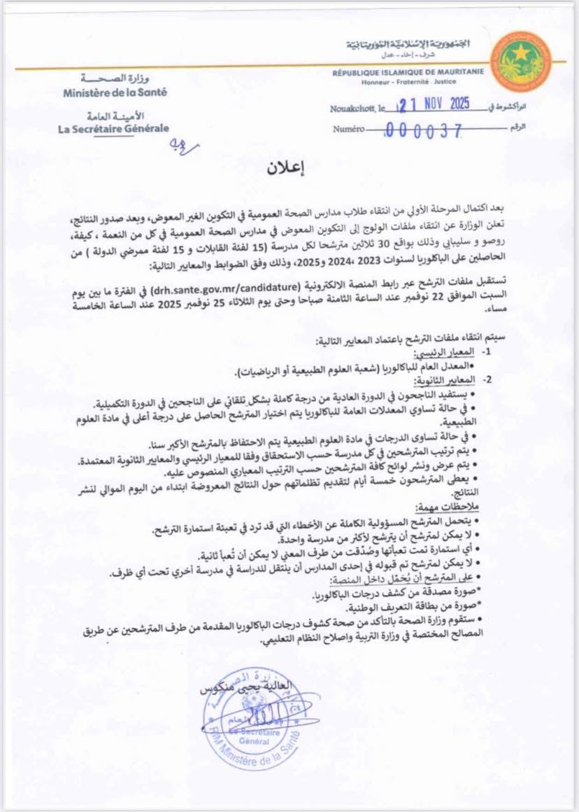 تستقبل ملفات الترشح عبر رابط المنصة الإلكترونية (drh.sante.gov.mr/candidature) في الفترة ما بين يوم الجمعة 22 نوفمبر عند الساعة الثامنة صباحا ويوم الثلاثاء 25 نوفمبر 2025 عند الساعة الخامسة مساء.