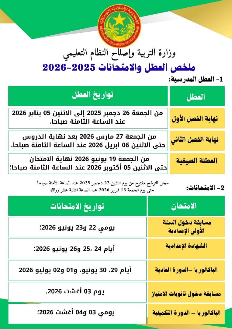 اعلنت وزارة وإصلاح نظام التعليم جدول الامتحانات والعطل المدرسية والمسابقات الوطنية للعام الدراسي، 2025/2026.