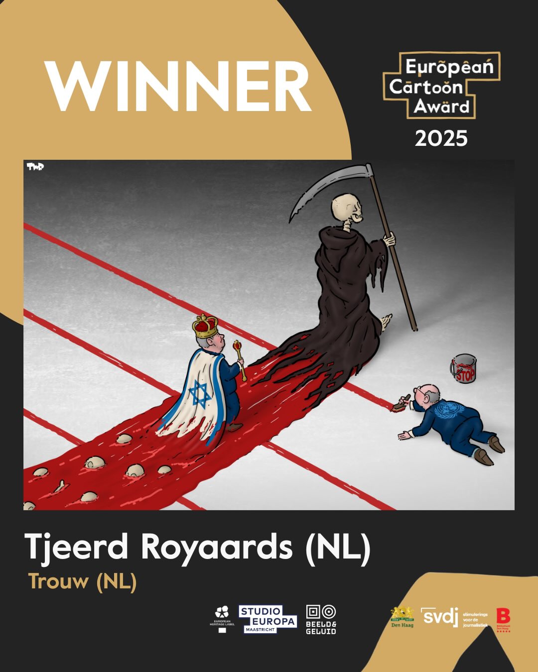 أعلنت لجنة جائزة الكاريكاتير الأوروبي اليوم السبت فوز الفنان الهولندي تايرد روياردز بجائزة العام في نسختها السابعة عن رسم يدين الإبادة التي تعرض لها الفلسطينيون على يد الاحتلال الإسرائيلي، ممثلا في رئيس الوزراء بنيامين نتنياهو.