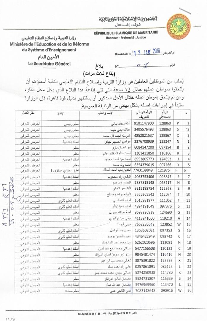 وشمل الإنذار والتهديد بالشروع في إجراءات الفصل والذي وقعه الأمين العام لوزارة التربية وإصلاح النظام التعليمي يحيى بوب الطالب، والأمين العام لوزارة الثقافة والفنون والاتصال والعلاقات مع البرلمان سيدي محمد جدو خطري مختلف الأسلاك التربوية.