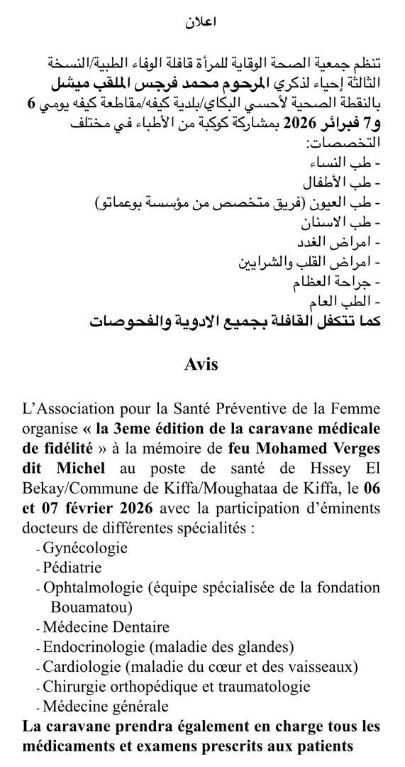 Feb 01 / التعليقات جمعية الصحة الوقائية للمرأة تعلن تاريخ انطلاق قافلتها الصحية لهذا العام (إعلان) من ارشيف عمل القافلة أحد, 2026/02/01 - 11:28 إضافة تعليق جديد اسمك التعليق About text formats Restricted HTML وسوم إتش.تي.إم.إل المسموح بها: <a href hreflang> <em> <strong> <cite> <blockquote cite> <code> <ul type> <ol start type> <li> <dl> <dt> <dd> <h2 id> <h3 id> <h4 id> <h5 id> <h6 id> تفصل السطور و الفقرات تلقائيا. Web page addresses and email addresses turn into links automatically.