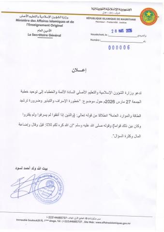 أعلنت وزارة الشؤون الإسلامية والتعليم الأصلي عن توجيه الأئمة والخطباء إلى توحيد خطبة الجمعة المقبلة، الموافق 27 مارس 2026، لتتناول موضوع “خطورة الإسراف والتبذير وضرورة ترشيد الطاقة والموارد العامة”.