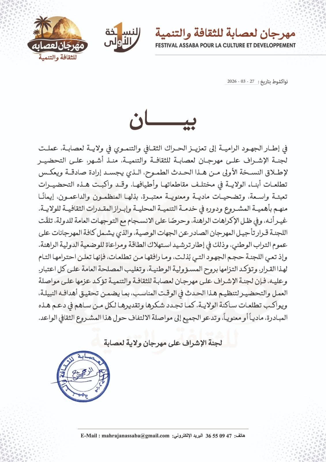 بيان من اللجنة المنظمة لمهرجان لعصابه للثقافة والتنمية