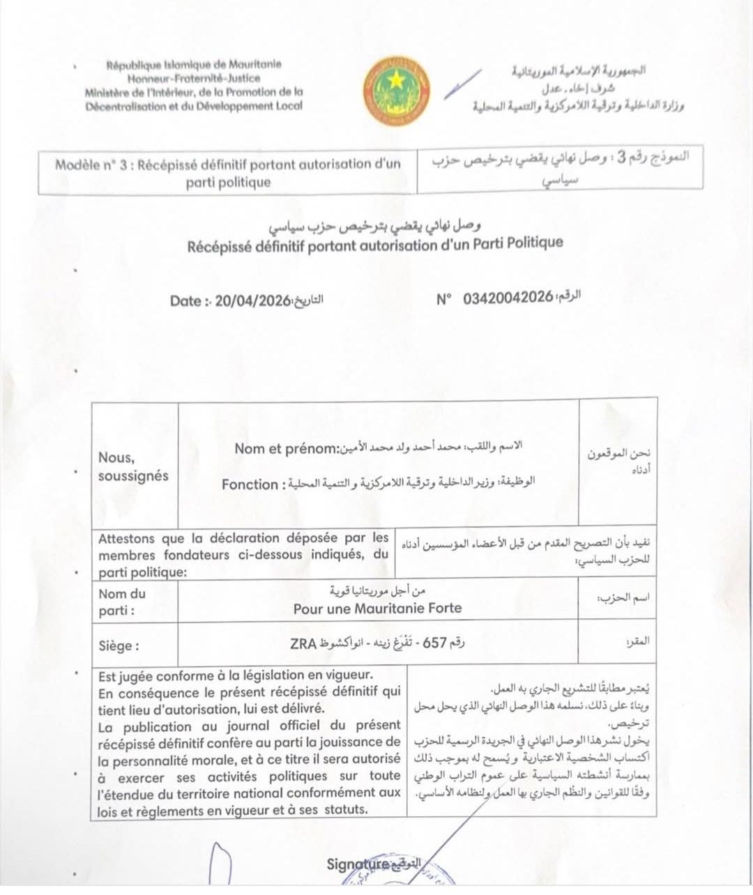Apr 20 / التعليقات الترخيص النهائي لحزب موريتانيا قوية منحت وزارة الداخلية وترقية اللامركزية والتنمية المحلية في موريتانيا ترخيصًا نهائيًا لحزب سياسي جديد يحمل اسم “من اجل موريتانيا قوية”، وفق وصل رسمي صادر بتاريخ 20 أبريل 2026.وبرأس الحزب السياسي الشاب عبد الرحمن ولد حمودي. اثنين, 2026/04/20 - 17:47 إضافة تعليق جديد اسمك التعليق About text formats Restricted HTML وسوم إتش.تي.إم.إل المسموح بها: <a href hreflang> <em> <strong> <cite> <blockquote cite> <code> <ul type> <ol start type> <li> <dl> <dt> <dd> <h2 id> <h3 id> <h4 id> <h5 id> <h6 id> تفصل السطور و الفقرات تلقائيا. Web page addresses and email addresses turn into links automatically.